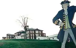 The Loyalist Man is an iconic sign located near the Reversing Falls in Saint John, New Brunswick, Canada. The figure was conceived of by Jim Stackhouse and painted by Ron Howard.[1] It represents a Loyalist soldier from the American Revolution, as many of Saint John's early settlers were Loyalists. The sign was first displayed in the 1950s though it has been taken out of use on occasion. It was originally created to encourage residents to shop at local stores.[2] In 2005 the city replaced it with a "generic explorer figure" in an attempt to refurbish the city's image[3] but it eventually returned. In 2014 the sign was removed temporarily for repairs after it lost a leg. The City of Saint John has used the image on other signs, pins and various marketing materials over the years. Loyalist Man was also featured as a superheroic character in the Interaction School of Performing Arts' The Saint John History Mystery, as portrayed by Elijah Wilcott.[4]