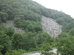 Yellow Creek flows eastward through the gap towards its junction with the Raystown Branch of the Juniata River. Periglacial boulder fields are present on both sides of the water gap, and the boulders are formed of the Silurian Tuscarora Formation.[1]