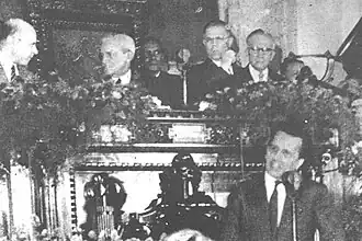 In 1935, he was made a member of the executive committee of the Communist International and is reported to have earned the confidence of Stalin.[8] In that same year, he became the leader of the Aliança Nacional Libertadora (National Liberation Alliance) (ANL), a left-wing popular front, consisting of socialists, communists, and other progressives led by the Communist Party in opposition to Vargas' crackdown against organized labor.[8]