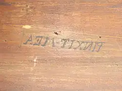 The panel is constructed of two main vertical sections of wood of irregular width and joined with two inset butterfly joints. There are narrow horizontal sections of timber at the top and bottom of the panel. These sections have half-lapped mitre joints to the verticals, visible at the front of the panel. The rear of the panel has the words "PINXIT MEA" painted on it. It is written in Roman capital letters, in "mirror writing" so that the whole inscription is reversed and reads from right to left. The inscription runs down the left side of the reverse of the painting, rather than across it.