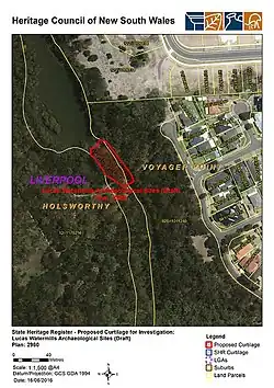 - ^ a b c d e f g h i j k l m n o p q r s t u v w x y z aa ab ac ad ae af ag ah ai aj ak al am an ao ap aq ar as at au av aw ax ay az ba bb bc bd be bf bg bh bi bj "Lucas Watermills Archaeological Sites". New South Wales State Heritage Register. Department of Planning & Environment. H01989. Retrieved 2 June 2018.