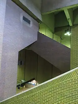 The station, planned under the name "Aqueduc",[5] was designed by the firm of David, Boulva & Cleve. A sculptural grille by Jean-Jacques Besner covering a ventilation shaft is the only artwork. The station is a normal side platform station, with a mezzanine on its eastern end, which is connected to the exit by an extremely deep open shaft. Passengers have to descend the greatest distance to reach the platforms of any station in Montreal (only Charlevoix and Berri-UQAM have deeper platforms, but those stations also have additional platforms that are shallower).