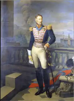 In 1808 he was made colonel of a regiment of Veliti a cavallo in the army of the Napoleonic Kingdom of Naples. In 1810, a French Colonel Durand seeking to reassign several of the best cavalrymen in the Duke's regiment to a new regiment of Cuirassiers Durand had been ordered to form, the Duke felt himself affronted at having his men stolen and challenged Durand to a duel over the transfer. The two men met on horseback in full uniform and charged each other with sabres twice before Roccaromana's blade cut a wound along his opponent's arm and the affair was ended in the Duke's favour.[1] In 1812, he was appointed by Murat to be his Grand Equerry.[2] He accompanied his king on the Russian Campaign where, during the retreat, he lost all fingers on his left hand through frostbite. Having driven off an attack of cossacks, Roccaromana and his cavalry formed for a time part of Napoleon's escort as the Emperor was taken in a sleigh back to Vilna ahead of the main army.[3] He was present at Battle of Tolentino in 1815, where his only son, Ernesto, then aged twenty-two, was killed before him and Murat's army totally defeated.