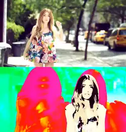 The video was really relaxed... it was so hot. I was literally dripping! Not nice! In between takes I had about 5 fans on me, one up the front of my dress, one up the back of my dress. I was wearing trainers again—I learnt from the day before that I needed to bandage my feet up so they couldn't expand anymore! We couldn't play music on the street so I was wearing an ear piece with my track playing. Loads of people were stopping and looking at me like I'd lost it, jumping up and down to what they thought was no music playing! Gotta do what you gotta do! Everyone worked so hard in getting the video together considering the conditions, I was really grateful![3]