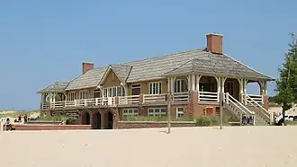 The Ludington State Park Beach House is a two-story square plan building measuring 116 feet (35 m) by 35 feet (11 m).[2] It sits on a concrete foundation, and has red brick walls on the lower story, wooden singles on the upper story, and a cedar shingle hip roof.[3] Three brick archways on the lower floor provide access from the beach house directly to the Lake Michigan beach.
