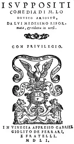 In 1508 Ariosto's play Cassaria appeared, and the next year I suppositi was first acted in Ferrara and ten years later in the Vatican. A prose edition was published in Rome in 1524, and the first verse edition was published at Venice in 1551. The play, which was translated by George Gascoigne and acted at Gray's Inn in London in 1566 and published in 1573, was later used by Shakespeare as a source for The Taming of the Shrew.