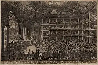 The wooden theater, which Giovanni Burnacini had built in Regensburg in 1653 on the occasion of the Reichstag, was dismantled and shipped down the Danube to Vienna, to be re-erected on the Rosstummelplatz (riding arena) in summer 1659, at Emperor Leopold I's request. It became an extremely popular comedy house and was an impressive theater “in the size and height of a fairly large church building” with a spacious ground floor and two tiers with 60 boxes (“Zimmerl”), which is said to have offered space for “several thousand people”. The multiple backdrops allowed scene changes “well eight manner without pulling a single curtain.”[9][10][11]