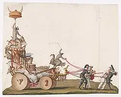 On 1 January 1659 — after Angelini's death — Lodovico Ottavio Burnacini was appointed as imperial court architect and stage designer, a position he held for the rest of his life.[8] From the very beginning, Lodovico Ottavio had to prove himself with all the skills of his art, because in Vienna, plays, concerts and ballets were performed almost daily at the imperial court. Church holidays, carnival, state visits as well as joyful events at the court such as weddings, births, coronations etc. naturally gave rise to a demand for increasingly greater festivities. For such events the young theater engineer not only designed stage decorations and costumes, but had to build entire theaters and to invent stage machines and parade floats that served to amuse the emperor and his guests. Although it was interrupted by the plague in 1679 and the Turkish siege in 1683, there was an extremely lively cultural life in Vienna in the late 17th century, in which Burnacini played a major role.