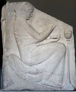 The iconography of the subject is without a parallel in Antiquity, thus the very subject of the relief is in doubt. Alternative views, since the flanking attendants stand on pebbled ground, have been offered: that the emerging figure is that of the ritual robing of a chthonic goddess, probably Persephone, rising from a cleft in the earth[3] (Pandora is similarly shown in Attic vase-paintings) or of Hera emerging reborn from the waters of Kanathos near Tiryns as Hera Parthenos.[4]