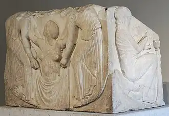 The Ludovisi Throne is an exceptional ancient sculpture from Locri, Southern Italy.[1] Not an actual throne, the sculpture is white marble block intricately carved with bas-reliefs on its three visible sides, with its primary depiction considered by many as depicting Aphrodite rising from the sea. It originates from the transitional phase between the Archaic and Early Classical styles, circa 460 BC. Currently, it resides in the Museo Nazionale Romano of Palazzo Altemps in Rome, having been acquired by Italy in 1894.