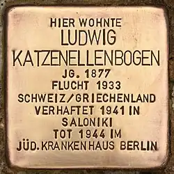 When the Nazis came to power, the couple fled with two suitcases and 200 marks.[12] In 1933, he fled with Tilla Durieux, first to Ascona in Switzerland, and emigrated from there, in 1935, to Zagreb (Kingdom of Yugoslavia), where a distant relative of his wife lived. While she was trying to obtain a visa in Belgrade for both of them to emigrate to the US, she was surprised by the German bombing and raid on Belgrade in April 1941, and was thus separated from her husband. Katzenellenbogen was arrested by the Gestapo in Saloniki in 1941, and deported to the Sachsenhausen concentration camp north of Berlin.[13][14] He died in 1944 in the Jewish Hospital Berlin.