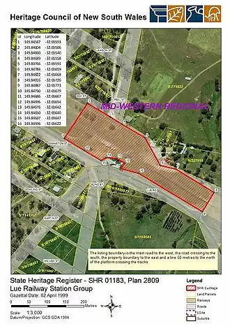 - ^ a b c d e "Lue Railway Station group". New South Wales State Heritage Register. Department of Planning & Environment. H01183. Retrieved 2 June 2018.