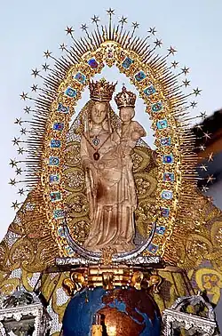 The church is of artistic interest for its Gothic-Mudéjar architecture, as well as the grand rooms decorated with frescos by Daniel Vázquez Díaz, the cloister, and the museum, which holds numerous objects commemorating the discovery of America.[8] Above all, there is the namesake of the monastery, the fourteenth century statue known as the Virgin of Miracles or Saint Mary of La Rábida. It is an elegant example of Gothic Mannerism, bringing the figure a particular curvature, such that it changes in aspect from even small differences of perspective. Columbus and his men prayed before this figure the night before their departure. The statue was crowned by Pope John Paul II 14 June 1993.[9][10] It is the only image of the Virgin Mary that John Paul crowned in Spain.