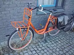 A Dutch utility bicycle with a rack attached over the rear wheel. -