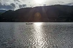 The Gaizu River, flowing out of the lake at its southeast end, has a controlled outlet that is only operated during the rainy season and remains closed from September to May. Lugu Lake is snowbound for three months a year; in the autumn and spring, it has a cool and dry climate with warm daytime temperatures.[4][5][6]