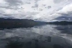 Lugu Lake is a natural lake in the Hengduan Mountain System, and has a horseshoe shape. It is bounded within geographic coordinates of 27°40′59″N 100°45′00″E / 27.683°N 100.75°E and 27°45′00″N 100°49′59″E / 27.75°N 100.833°E. It is located in a high plateau amidst the Xiaoliangshan hills of Western Yunnan. The Lion Mountain that surrounds the lake, which is worshipped as the goddess Gammo, is the chief deity of the Mosuo people who inhabit the area. The lake has a drainage catchment of 171.4 square kilometres (66.2 sq mi). The lake's main storage is from rainfall and its waters display a turquoise blue colour. The south shoreline of the lake is located in Yi Autonomous region of Ningland. The lake has a length of 9.4 kilometres (5.8 mi) with a width of 8 kilometres (5.0 mi) (mean width is 5.2 kilometres (3.2 mi)) and a water spread area of 50 square kilometres (19 sq mi) (48.5 square kilometres (18.7 sq mi) is also mentioned) and an average depth of 45 metres (148 ft). The maximum depth in the lake is reported at 93.5 metres (307 ft) (90 metres (300 ft) is also mentioned in some references) which makes it the second deepest lake in China, after the Fuxianhu Lake. Lugu Lake is hemmed on both sides by steep mountains and partially forested slopes; it is fed by the Mosuo River and drained by the Gaizu River, which joins the Yalong River and eventually merges into the Jingshajiang River or the Yangtze River. Geologically, it is inferred as one of the youngest fault lakes in the Yunnan Plateau.[2][4][5][12][13][15]