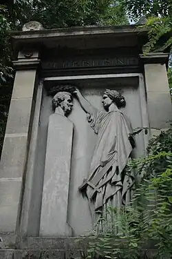 Cherubini died in Paris in 1842 at age 81 and is buried at Père Lachaise Cemetery, just four metres from his friend Chopin. His tomb was designed by the architect Achille Leclère and includes a figure by the sculptor Augustin-Alexandre Dumont representing "Music" crowning a bust of the composer with a wreath.
