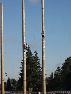 Contestant scales a 90-foot-tall (27 m) cedar spar pole and returns to the ground against time. Contestants compete on twin spar poles. Contestant must climb within the front 240 degrees of the sparring pole, as marked. Timing begins on the signal "go" and ends when the contestant touches the ground after ringing one of the two bells on top of the spar pole. At the starting signal, contestants must have one foot on the ground and the other foot below the orange line as marked on the sparring pole. On the descent climbers are required to touch inside each section. Contestants use spurred climbers and steel-core climbing ropes to scale the spar poles.