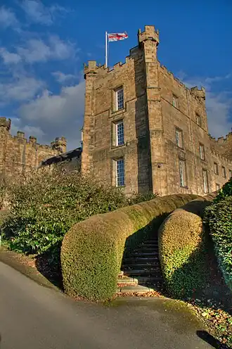 The castle is believed to be one of the most haunted places in County Durham, which includes a story about a woman named Lily Lumley who married Ralph Lumley.[7][8] In reality, the said Ralph Lumley, 1st Baron Lumley (c. 1360 – January 1400) was married to Eleanor Neville. But in a tale called The Lily of Lumley he has a previous wife.[9] She was supposedly thrown down a well in the castle grounds by two priests for rejecting the Catholic faith,[10] who then told Baron Lumley she had left him to become a nun. Her ghost is said to float up from the well and haunt the castle.[11] A contemporary romance of medieval times, the tale was based on a legend of a lady of Lumley who was murdered. This woman is not identified in family pedigrees.[9] In 2000 and 2005, visiting cricketers staying at the castle claimed to have witnessed paranormal activity including Indian Captain Sourav Ganguly.[5][12][13] Several members of the 2005 Australian tour party recounted the strong effect its reputation and setting had had on them.[14]