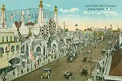 Luna Park was an amusement park that operated in the Coney Island neighborhood of Brooklyn in New York City, United States, from 1903 to 1944. The park was located on a site bounded by Surf Avenue to the south, West 8th Street to the east, Neptune Avenue to the north, and West 12th Street to the west. Luna Park was located partly on the grounds of the small park it replaced, Sea Lion Park, which operated between 1895 and 1902. It was the second of the three original, very large, iconic parks built on Coney Island; the others were Steeplechase Park (1897, by George C. Tilyou) and Dreamland (1904, by William H. Reynolds).[1] At Coney Island's peak in the middle of the 20th century's first decade, the three amusement parks competed with each other and with many independent amusements.