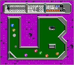 The value of each ball is determined by its number and the displayed "Rate" value, which starts at 1 and increases after every shot where the player pockets at least one ball. Failing this resets the Rate to 1. Bonus points are awarded for completing a level without a miss.