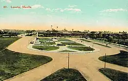 Rizal Park's history began in 1820 when the Paseo de Luneta was completed just south of the walls of Manila on a marshy patch of land next to the beach during the Spanish rule. Prior to the park, the marshy land was the location of a small town called Barrio Nuevo ("New Borough" or Bagumbayan in Tagalog) that dates back to 1601. The town and its churches, being close to the walled city, were strategically used as cover by the British during their attack. The Spanish authorities anticipated the danger posed by the settlements that immediately surrounded Intramuros in terms of external attacks, yet Church officials advocated for these villages to remain. Because of the part they played during the British Invasion, they were cleared after the short rule of the British from 1762 to 1764.[3] The church of Bagumbayan originally enshrined the Black Nazarene. Because of the order to destroy the village and its church, the image was then transferred to San Nicolas de Tolentino inside Intramuros, with a copy then translated to Quiapo Church. This has since been commemorated by the Traslación of the relic every January 9, which is more commonly known as the Feast of the Black Nazarene. This is why the processions of 9/11 January 9 have begun there in the park beginning in 2007.[4] After the clearing of the Bagumbayan settlement, the area later became known as Bagumbayan Field where the Cuartel la Luneta (Luneta Barracks), a Spanish Military Hospital (which was destroyed by one of the earthquakes of Manila), and a moat-surrounded outwork of the walled city of Manila, known as the Luneta (lunette) because of its crescent shape.[5][6]