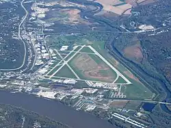 Lunken Airport was supplanted by the Cincinnati/Northern Kentucky International Airport after flooding from the Ohio River and introduction of larger aircraft that needed longer runways.[10] The flooding prompted the airport's nickname of "Sunken Lunken".[a] During the Ohio River flood of 1937, the airfield and two-story main terminal building at the southwest corner of the airport were submerged, except for the third-floor air traffic control "tower". A plaque (which appears from ground level to be a single black brick) on the terminal building, facing the airfield, indicates the high-water mark.[13] The airport flooded again in 1945 and 1948.[14] However, the latter was not before the soon-to-be U.S. Air Force vacated the field in 1947.[15] As early as 1948 and continuing to at least 1966, the Greater Cincinnati Airmen's Club held an annual cross country air race at the airport.[16][17] In the early 1960s Conrad International Corporation, which upgraded Beechcraft 18s, was located at the airport.[18] In 1962, Wilmer Avenue, the western border of the airport, was moved westward.[19] In 1964 the FAA designated the airport as a general reliever airport. As business jet travel expanded, the 6,100-foot parallel runway 2R was added about 1965 (requiring relocation of the Little Miami River).[8] In 1967, its name was officially changed from "Lunken Field" to "Lunken Airport".[20] The Ohio Aerospace Expo was held at the airport in 1978.[21]