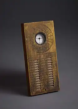 The oldest precursors of the luopan are the ; shì or 式盤; shìpán, meaning astrolabe or diviner's board—also sometimes called liuren astrolabes[5]—unearthed from tombs that date between 278 BCE and 209 BCE. These astrolabes consist of a lacquered, two-sided board with astronomical sightlines. Along with divination for Da Liu Ren, the boards were commonly used to chart the motion of Taiyi through the nine palaces.[6][7] The markings are virtually unchanged from the shi to the first magnetic compasses.[5] The schematic of earth plate, heaven plate, and grid lines is part of the "two cords and four hooks" (二繩四鉤; èrshéngsìgōu) geometrical diagram in use since at least the Warring States period.[5] The zhinan zhen or south-pointing needle, is the original magnetic compass, and was developed for feng shui.[8] It featured the two cords and four hooks diagram, direction markers, and a magnetized spoon in the center.