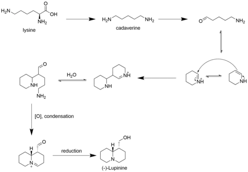Lupinine is naturally biosynthesized from l-lysine in the Lupinus genes of plants along with various other quinolizidine alkaloids. In the biosynthetic process, lysine is first decarboxylated into cadaverine, which is then oxidatively deaminated to the corresponding aldehyde. The aldehyde is then spontaneously cyclized into two tautmers which couple through an aldol type mechanism in which the allylic amine attacks the iminium, forming a dissymmetric dimeric intermediate which is then hydrated. The primary amine is then oxidized and an intramolecular condensation occurs, giving the quinolizidinealdehyde. The aldehyde is then reduced to an alcohol, giving, enantioselectively, (-)- lupinine.[3][18]