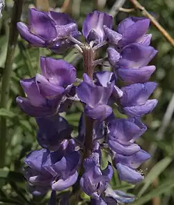 The flowers of Lupinus caudatus are 8–12 millimeters long with a conspicuous blunt spur that is 0.4–1 millimeter long.[1][2] Most often the flowers are blue-purple in color, but occasionally they will be white.[3] The banner petal is covered with hairs (pubescent) on its back side and its front grove. The lower lip, also called the keel, is often at least partially fringed with hairs (ciliate).[2] The blooming period begins in May in Utah and Colorado. While it begins in June in Wyoming and Montana.[1]