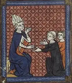 ![]() Saint Lupus of Sens giving alms—from a 14th-century manuscript | |