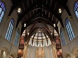 Luther Memorial's music program is led by Andrew Schaeffer, who has served as the director of music since 2018.[9] Three pipe organs are used in worship: a 56 rank Austin pipe organ, a Steere tracker organ, and a Bedient portative organ.[10][5][11] The church hosts the winter choral concerts presented by UW-Madison's choirs each December.[12] Luther Memorial has twice been a venue for concerts by the St. Thomas Choir of Leipzig, a boys' choir founded in 1212. Luther College and St. Olaf College choirs also regularly perform in the church's nave.
