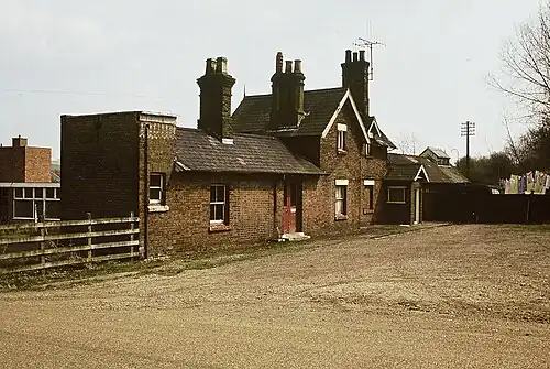 Luton Hoo railway station was built by the Hertford, Luton and Dunstable Railway on the branch line between Hatfield and Dunstable. It opened in 1860 and was originally called New Mill End. In 1861 the station and line was taken over by the Great Northern Railway. The Prince of Wales, the future George V, who had travelled by special train from King's Cross alighted at the station on 5 December 1878 on a visit to Luton Hoo. A crowd cheered the Prince on his arrival. A carpet was laid along the station platform over which a wooden roof decorated with evergreens and scarlet cloth was erected.[1] The station's name was changed to Luton Hoo in 1891.[2] It was closed in 1965.[3] The last passenger train, packed with enthusiasts, was hauled by Brush Type 2 (later Class 31) D5589 on 24 April 1965.