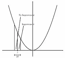 At each step, the LJ heuristic maintains a box from which it samples points randomly, using a uniform distribution on the box. For a unimodal function, the probability of reducing the objective function decreases as the box approach a minimum. The picture displays a one-dimensional example.