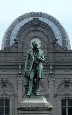 In the centre of the square is the Monument to John Cockerill, a prominent British-Belgian 19th-century industrialist, by the sculptor Armand Cattier, which is a near copy of the statue outside Seraing's Town Hall in Liège Province (Wallonia).[11] The figure of Cockerill is leaning on an anvil and is surrounded by industrial figures from that period: a glass-blower or blacksmith, a mechanic, a puddler and a coal miner.[12] On the front of the pedestal is the inscription "To John Cockerill, the father of workers". The base of the pedestal reads Cockerill's motto, "Intelligence" and "Work", as well as "1790-1840", Cockerill's dates of birth and death.[1]