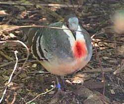 It is a medium sized ground dove. On its upper surfaces, the Luzon bleeding-heart is slate grey in color, but because of its iridescence, it can appear to be purple, royal blue, or bottle-green with varying lighting conditions. On their wings are black bands, while their belly and under wing areas are buff or chestnut. It has a white throat, chest and belly but its most distinctive part is its bright red "bleeding heart" at the center of its chest that has a surrounding faint pink that gives off the appearance of fading blood stains. [4]