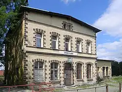 The railway station, dating back to 1885,[7] is located on the western side of the station, at 1 Dworcowa Street.[18] The station building is two-story and masonry, currently serving mainly residential purposes. Attached to the station is a warehouse with a loading ramp. The entire complex has undergone renovations in the past. Originally, the station had a wooden-masonry extension with a veranda (on the southern side) and additional warehouses (on the northern side).[7]