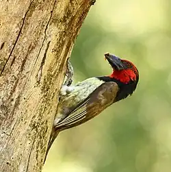 The black-collared barbet usually is about 20–25 cm long, plump-looking and has a large head. It also has the heavy bill fringed with bristles that is characteristic of the genus Lybius.[4] This barbet has a very obvious black collar and head which gives reference to its name. It also has a fire-engine red coloring around the eyes and beak.[5] It has morphologically variable coloring because there is a replacement of a red head with a black head. It also has a more intense color and is larger than other barbets. This bird is also sexually monomorphic, which means that there is generally no phenotypic difference between the males and females of this species. The morphology, size and behavior are basically the same.[6]
