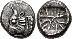 - ^ Hill 1897, p. xxvi. – Coin Series I of the British Museum, bearing the KUB, is dated by Hill to the window 520–480, somewhat less precisely than the 520–500.