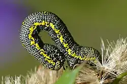 The larvae feed on various low-growing plants, Leucanthemum, Rosa, Salix, Scabiosa and Sisymbrium species. It overwinters as a pupa.