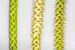 The powder consists of the dry spores of clubmoss plants, or various fern relatives principally in the genera Lycopodium and Diphasiastrum. The preferred source species are Lycopodium clavatum (stag's horn clubmoss) and Diphasiastrum digitatum (common groundcedar), because these widespread and often locally abundant species are both prolific in their spore production and easy to collect.