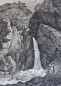 The village is on the small River Lyd, which traverses a deep narrow chasm, crossed by a bridge of single span. Running south-west from the village is Lydford Gorge, a 1+1⁄2 miles (2.4 km) wooded gorge which has been cut through the slate rock by the river, and is noted for its 30-metre (98 ft) waterfall. The gorge area is owned by the National Trust.[3]