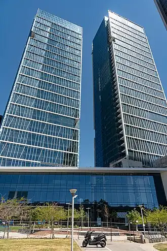 The Lyfe Towers is an office skyscraper complex in Bnei Brak, Israel. Built between 2018 and 2022, the complex consists of two twin towers slightly different in height, standing at 175 m (574 ft) with 42 floors (Tower B) respectively 160 m (520 ft) with 37 floors (Tower A), with the taller one currently being the 10th tallest building in Israel.[3]