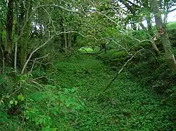 A mineral railway ran up to the site, running through the woods, parallel to the main road from the old Kilmarnock to Dalry mainline railway. A railway or tramway also ran up to a limestone quarry near to High Monkredding and another railway in 1909 ran from the Lyslestone limestone quarry near Darmule Farm to the Lylestone Brick and Pipe Works at High Gooseloan that were connected to the old Dalry to Kilmarnock railway line. Coal pits were located near to the Lylestone Row and also close to Golconda, the old Monkreddan lodge. A tramway is shown in 1909 as running from Sevenacres Quarry to Sevenacres Mill and from there to Fergushill.[8] A limestone quarry also existed at nearby Goldcraigs.