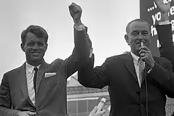 He entered the primaries starting with New Hampshire on March 10. There were no official candidates on the New Hampshire ballot, so both Kennedy and Johnson were write-in candidates.[18]Some Kennedy supporters organized a Kennedy-for-vice-president write-in campaign, which gave him almost 25,000 voted for vice president.[18] He had a four-to-one edge over Hubert Humphrey, his closest opponent.[19] Johnson won New Hampshire with almost 29,000 votes, and Kennedy issued a statement that evening saying that the choice of a vice-presidential candidate should be made by Democratic convention in August, guided by the wishes of President Johnson.[18] Shortly after the primary, Johnson began tossing out names of possible running mates. He initially considered Kennedy's relative Sargent Shriver, but eventually rejected the idea asserting that Shriver's presence on the ticket would still have raised questions about his capacity to win on his own.[20]