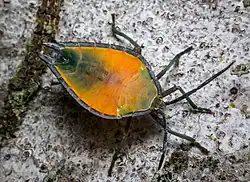 As oncomerine insects, the life cycle of Lyramorpha consists of the three stages of egg, nymph and adult. Eggs are barrel-shaped and are laid in groups of 40–42. From these hatch first-instar nymphs, which are soft, semi-globular in shape and slow-moving. Intermediate stage nymphs are extremely flattened in shape, allowing them to lie flat against leaves with the vulnerable legs under the body. Nymphs also have a pair of scent glands on top of their bodies, from which they produce a pungent liquid if disturbed.[4]