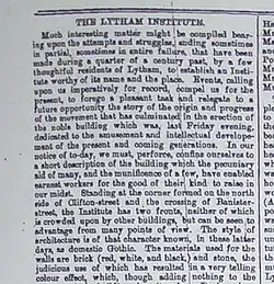 The Lytham Times of September 4, 1878 [2] included a 2-page supplement celebrating the opening of the Institute by the Right Honourable George Cavendish Bentnick, MP. It describes a public meeting, addressed by the Bishop of Manchester, and held on 22 October 1876 which was arranged to examine the possibilities of the building of the Institute. There was an initial donation of £300 from Lady Eleanor Cecily Clifton of Lytham Hall. Numerous other donations followed including £1000 by the Misses Hewitt of Lytham. Their contribution is commemorated in the name of the Hewitt Lecture Room.