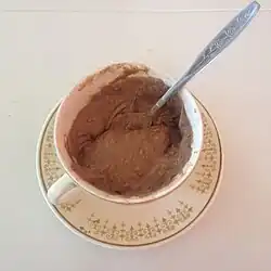Máchica is used in a variety of foods that are part of Andean cuisine. These include chapo, an herbal tea decoction made with lemongrass, lemon verbena or other herbs; another beverage called colada de máchica made by mixing the máchica with hot or cold liquid; nogadas, a nougat confection made using panela (unrefined cane sugar), eggs, máchica and a variety of walnut called toctes; pan de máchica, a variety of bread baked using máchica in addition to untoasted flour; pinol—akin to but distinct from pinole—a beverage prepared in a manner similar to colada de máchica but which also includes ground panela and spices such as anise, cinnamon and cloves; sopa con máchica, any of a variety of savory soups or stews thickened with máchica; and torta de máchica, a cake baked with máchica.[3] Soups to which máchica is added typically have a base of carrots, legumes, onions and potatoes, and may or may not contain meat.[4] It is used to batter and season meat to be fried, such as pork rinds[1] or shellfish including shrimp.[5] Máchica is sometimes also added to hot chocolate[2] or cold juice, and has been used to flavor ice cream.[6] It is incorporated into stroopwafels (a cookie which originated in the Netherlands) made in Peru and filled with other Andean ingredients such as passion fruit and chicha.[7] Some indigenous peoples use máchica to prepare cuy, a traditional meat.[4]
