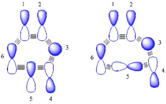 The two orbital arrays in Figure 3 are just examples and do not correspond to real systems. In inspecting the Möbius one on the left, plus–minus overlaps are seen between orbital pairs 2-3, 3-4, 4-5, 5-6, and 6-1, corresponding to an odd number (5), as required by a Möbius system. Inspection of the Hückel one on the right, plus–minus overlaps are seen between orbital pairs 2-3, 3-4, 4-5, and 6-1, corresponding to an even number (4), as required by a Hückel system.