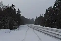 M-134 starts at the interchange for exit 359 along I-75 north of St. Ignace in rural Mackinac County near the St. Martin Bay of Lake Huron. As the highway runs eastward, it carries the Lake Huron Circle Tour over the Pine River on Huron Shore Drive. The trunkline turns to the southeast and follows the shoreline along the bay and runs inland at the bases of the peninsulas that form the Search Bay. Returning to a shoreline routing at Mismer Bay, M-134 runs through the wooded rural areas into Hessel. There Huron Shore Drive continues eastward to Cedarville where the highway meets the south end of M-129 north of Marquette Island. Farther east, M-134 runs along the north side of the many small bays and channels that separate the Les Cheneaux Islands from the mainland.[5][6] About 6 miles (9.7 km) west of Cedarville, M-134 crosses into Chippewa County for about a mile and a half (2.5 km); the highway passes back into a sliver of Mackinac County that extends along the Lake Huron shoreline for another 5 miles (8.0 km) before finally crossing back into Chippewa County.[1]